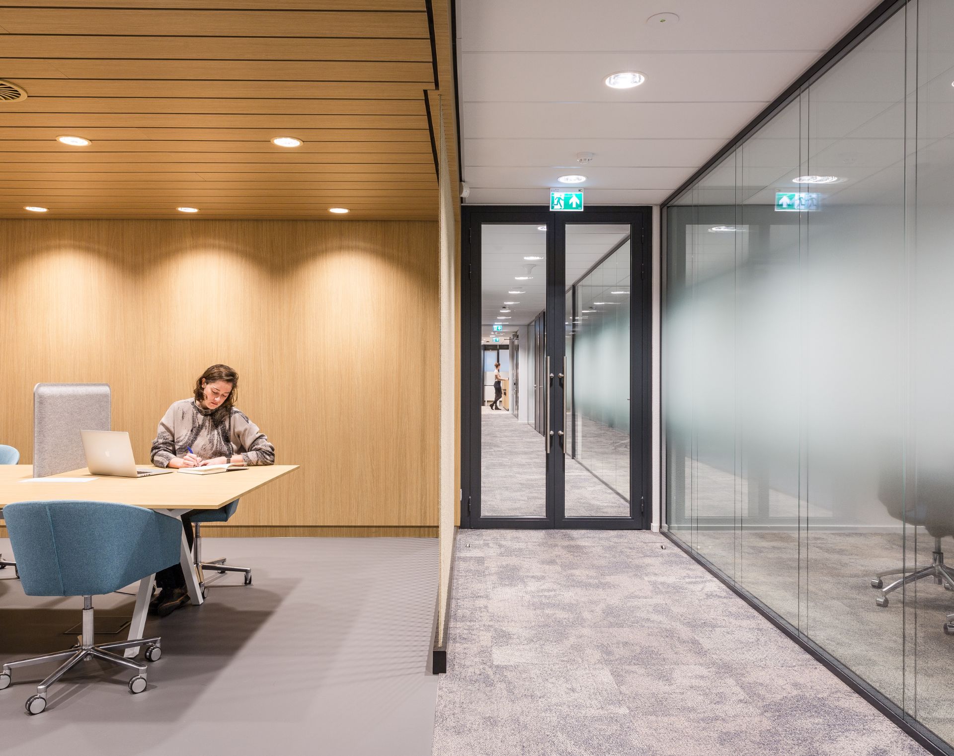 SERENITY biedt naast een uitstekende geluidsisolatie ook flexibiliteit in glasdiktes, profielkleuren en integratie met deuren of panelen. Dankzij de verfijnde detaillering en hoogwaardige materialen vormt deze hoogwaardige glaswand een elegante scheiding tussen werkzones, zonder het gevoel van openheid te verliezen.